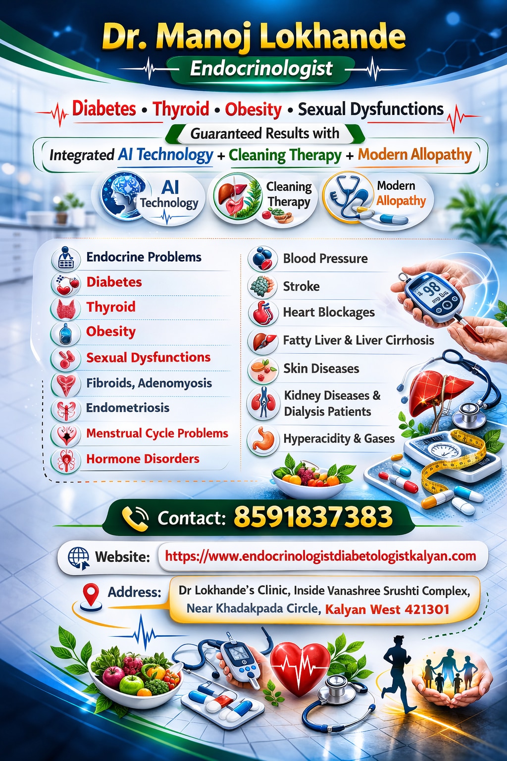 At Dr. Manoj Lokhande’s Endocrine & Integrated Care Clinic, we have developed a unique, integrative treatment model that combines Cleansing Therapy with Modern Allopathy, designed specifically to convert non-responsive diseases into responsive, manageable, and often reversible conditions. Understanding Why Diseases Become Non-Responsive Many chronic diseases—especially endocrine, metabolic, Obesity , cardiovascular, and inflammatory disorders—become resistant to treatment due to accumulation of metabolic toxins, environmental pollutants,food chemicals and inflammatory mediators What is Cleansing Therapy? Cleansing Therapy is a structured, medically supervised detoxification and metabolic restoration process designed to: Eliminate accumulated toxins from the body Restore organ function, especially liver, kidney, and gut Improve cellular sensitivity to hormones and medications Reduce chronic inflammation and oxidative stress Optimize metabolic and endocrine balance This therapy is not a generalized detox program—it is a scientifically guided, personalized intervention tailored to each patient’s clinical condition. This therapy improves following non responsive diseases to responsive Endocrine problems Fibroids, Adenomyosis Menstrual problems PCOD Infertility Hormone disorders Endometriosis Sexual dysfunctions Blood Pressure Stroke Heart Blockages Fatty liver and liver cirrhosis Skin diseases Kidney diseases and dialysis patients Hyperacidity and gases All above mentioned diseases will be controlled or cured also with guarantee. Number of medications can be also reduced significantly. Persons feels energetic and feels more younger. It best work as anti-aging. Dr. Manoj Lokhande’s integrated treatment model represents a significant advancement in chronic disease management. By combining cleansing therapy with modern allopathy, this approach shifts the focus from symptom control to root-cause correction and long-term prevention. If you are facing chronic health conditions that are not responding to conventional treatment, this integrated approach offers a new pathway to recovery and long-term wellness.