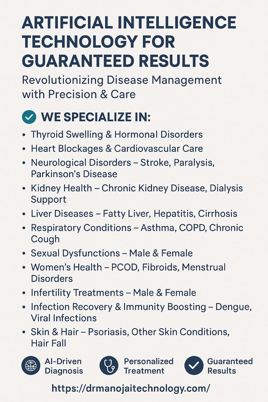 Unique guaranteed money back results in treatment of Stroke, Thyroid swelling, Eczema & Psoriasis, Male & Female sexual issues, PCOD and menstrual issues, kidney failure patients